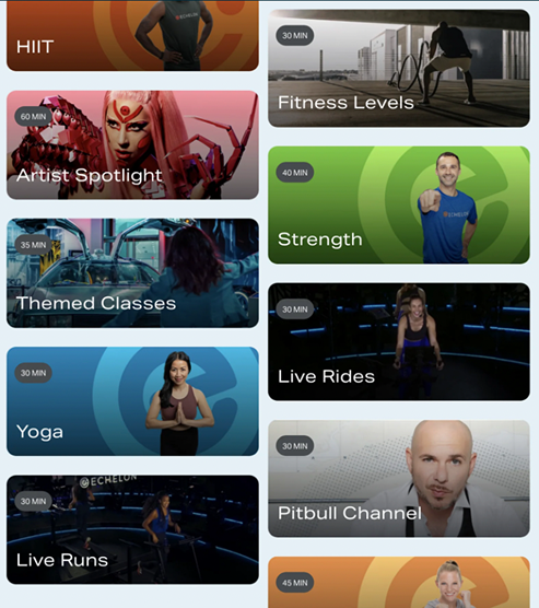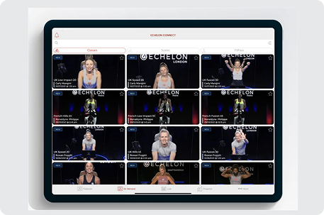 Echelon te permite a acceder a clases en vivo y on demand dirigidas por instructores certificados desde estudios en Estados Unidos, en Reino Unido y en Europa.Echelon Worlds permite a los usuarios competir virtualmente en mundos animados, como ciclismo, carrera y remo. Por otro lado, FitOS integra fitness y entretenimiento, permitiendo a los usuarios interactuar en redes sociales, ver películas y más, mientras hacen ejercicio.